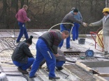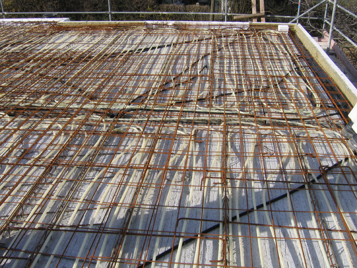 -2. Tag: Einziehen der ELT-Leerrohre, Verschalung der Decke außen, Einziehen der Rohre bei niedrigen Temperaturen (Rohre sehr steif), Aufbringung der Stahlmatten, Befestigung