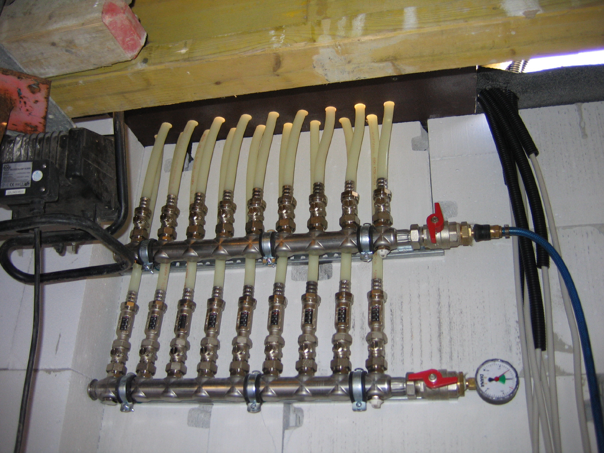 Die Rohre liegen genau über der Filigrandecke und damit über der unteren Bewehrungslage der Betondecke, jedoch unter der oberen Bewehrungslage der Betondecke, also im relativ gut gegen thermische Spannungen geschützten Bereich.