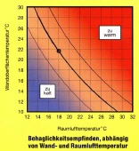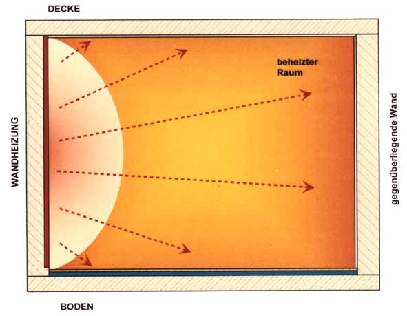 Moderate Übertemperaturen (20 - 35K) bei großen Heizflächen vergleichsmäßigen die Strahlungsbilanz für den Nutzer. Direkte Wärmestrahlung auf den menschlichen Körper, im Gegensatz zur Fußbodenheizung (diffuse indirekte Strahlung), wird als gemütliche Wärme empfunden. Die Lufttemperatur kann gegenüber konventionellen Heizungstechniken (Radiator) niedriger sein (17-18 °C) und dennoch bleibt die thermische Behaglichkeit für den Raumnutzer erhalten.