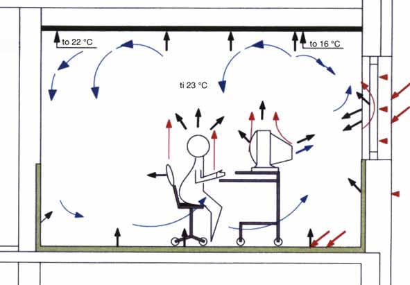 Behaglichkeit aufgrund mehrerer Faktoren. Zum einen führen die geringeren Zuluftströme, die jetzt durch den Mindestluftwechsel und nicht durch die Kühllast bestimmt werden, zu geringeren Raumluftgeschwindigkeiten. Des weiteren entspricht die empfundene Raumtemperatur etwa dem Mittelwert aus mittlerer Raumlufttemperatur und mittlerer Oberflächentemperatur der Umschließungsfläche.