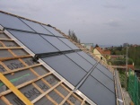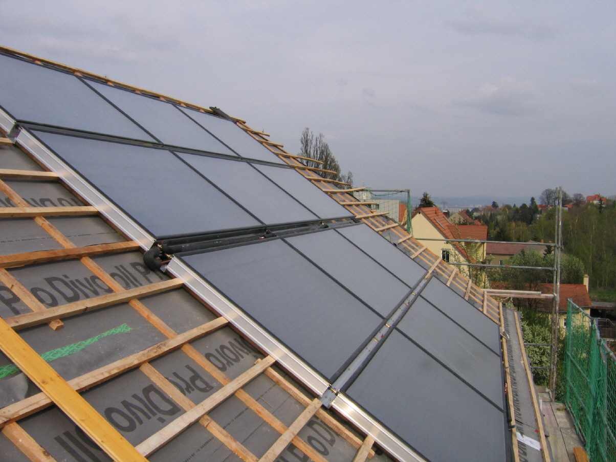 Die Solaranlage der Firma Weishaupt hat eine Größe von 30.6 m2 und ist in die Dachkonstruktion integriert. Es sind 12 Kollektoren von Typ WTS-F im Tichelmann-Prinzip