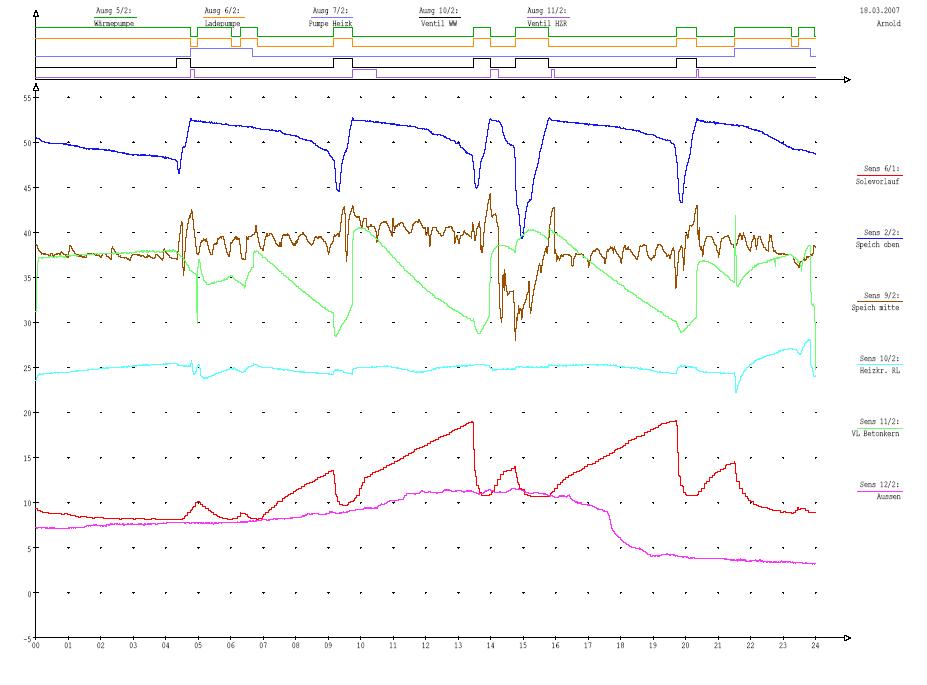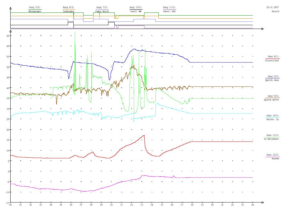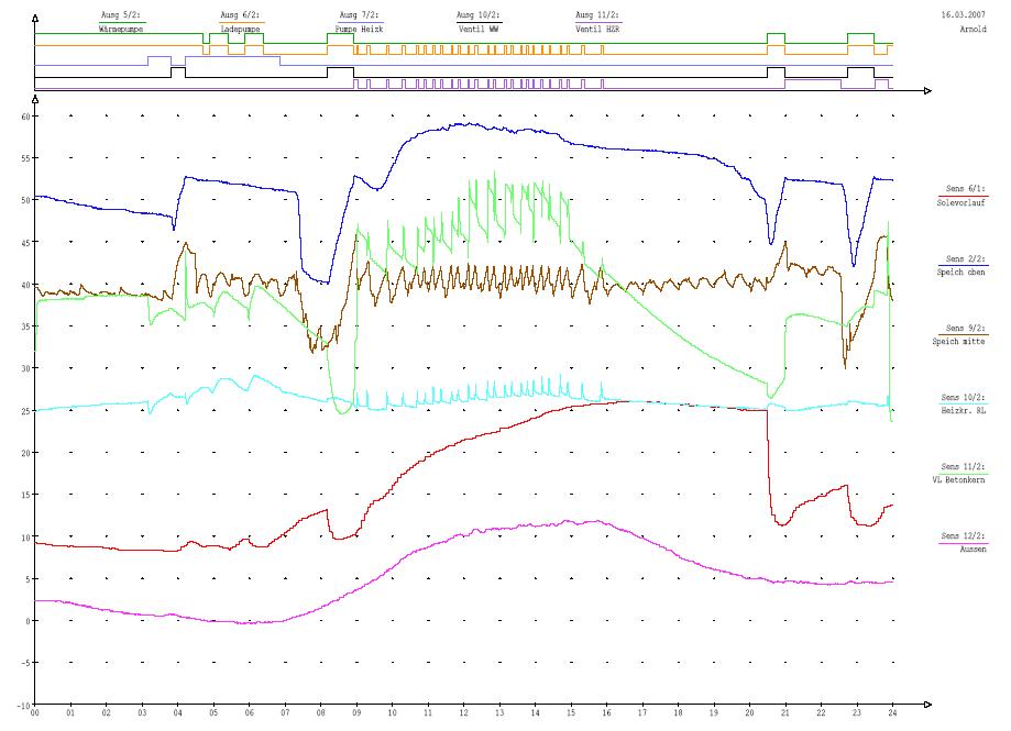 In den Nacht- und Morgenstunden heizt die Wärmepumpe mit einer Soletemperatur von ca. 7°C. Die Außentemperatur ist unter -5°C, bis fast -10°C. Die Solaranlage erzeugt ab späten Vormittag höhere Temperaturen, deckt den Wärmebedarf und speichert Energie in den Betonkernspeicher ein. In den Abendstunden ist die Aufzeichnung unterbrochen, da der Datenlogger andersweitig benötigt wurde.