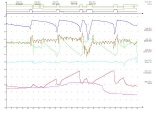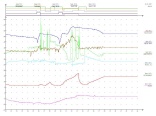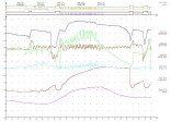 In den Nacht- und Morgenstunden heizt die Wärmepumpe mit einer Soletemperatur von ca. 8-10°C. Die Außentemperatur ist ca. 7-10°C. Während der Nachtstunden liegt die Soletemperatur nur unwesentlich über der Außenlufttemperatur. Die Wärmepumpe lädt mehrmals den Warmwasserteil des Puffers. Die Solaranlage hat keinen Ertrag. Während diese Zeit fällt die Soletemperatur kurzzeitig minimal unter die Außentemperatur. In den Abendstunden fällt die Außentemperatur wieder unter die Soletemperatur.