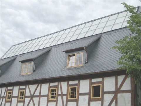Eine Solaranlage mit einer Gesamtfläche von 60m2 unterstützt die Heizungsanlage und bereitet warmes Wasser. Die Deckungsrate der Solaranlage an der gesamten Heizenergie des Hauses beträgt etwa 30%. Die Solaranlage wird im sog. "Trägflußprinzip" - "LOW-FLOW" betrieben. Die Steuerung unterscheidet zwischen oberen Speicherbereich für Warmwasser und unteren Speicherbereich für Heizung. Somit wird immer die ideale Ausnutzung der Anlage und damit ein hoher Wirkungsgrad erzielt.